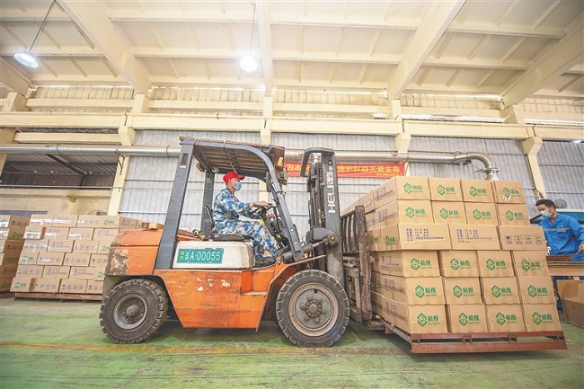 3月1日,在儋州海南農(nóng)墾寶聯(lián)林產(chǎn)有限公司內(nèi),工人們身著制服、戴著口罩,將一塊塊木板胚料制成大小均等、色澤相近的木地板條。