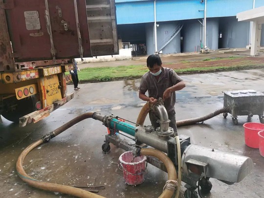 金福橡膠加工分公司員工正在裝運(yùn)濃乳。